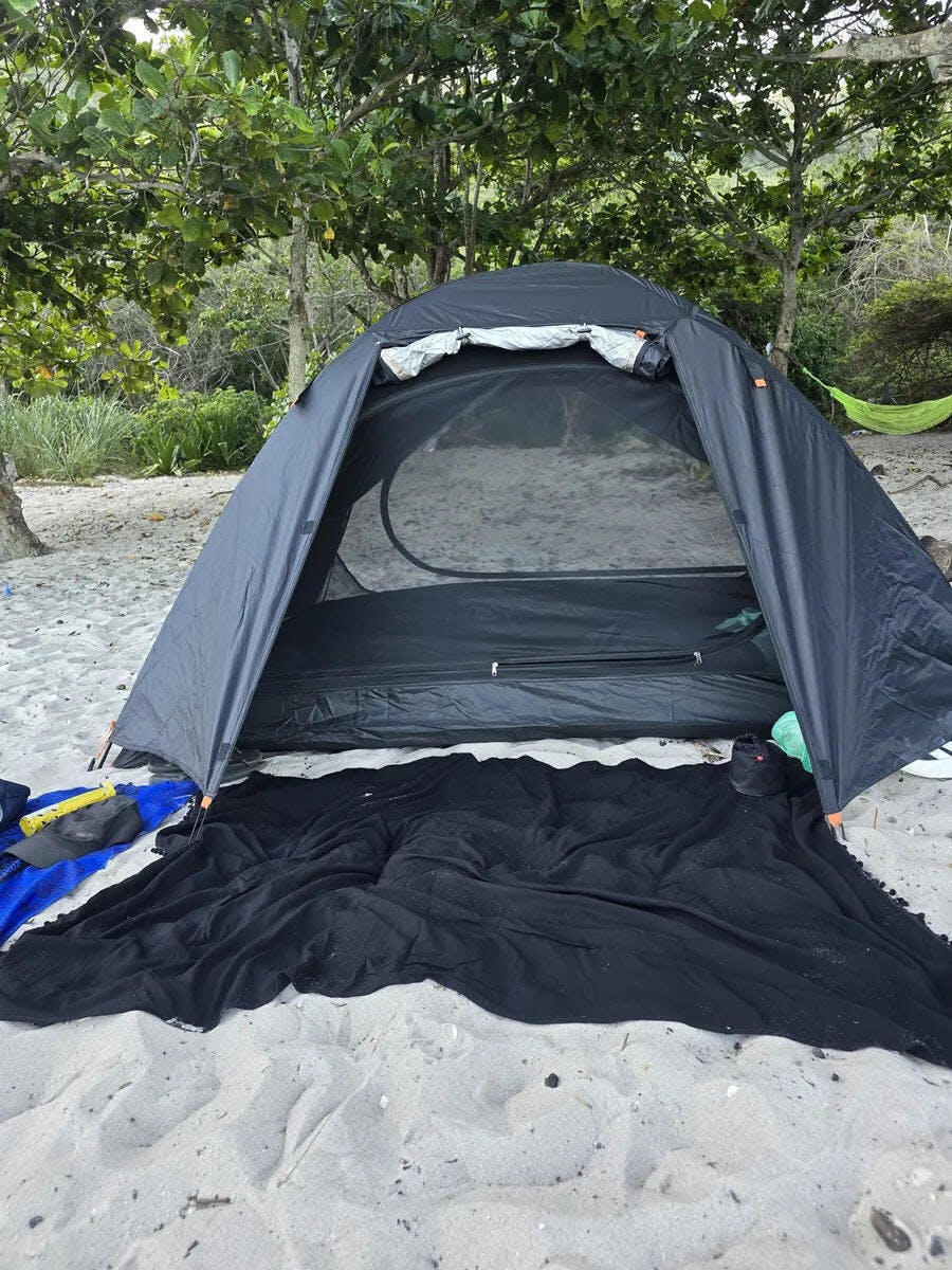 Há espaço suficiente na tenda para duas pessoas, podendo levar consigo mais uma criança ou um animal de estimação.